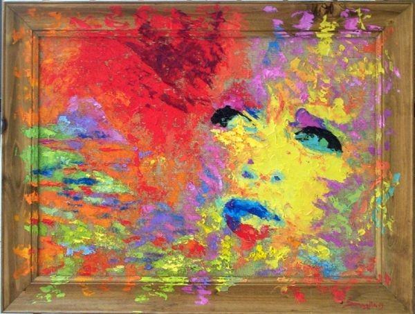 La juta si accende di un’insolita aggressività cromatica nell’attività artistica del pittore romano Giacomo Sonaglia, che ostenta uno stile composito caratterizzato da un espressionismo veemente. In “Sguardo” il colore erompe sulla cornice come un’estensione illusoria dell’opera; a questo gioco ottico fa da contraltare “Melanconia” recante un tonalismo volutamente più cupo ed enigmatico.