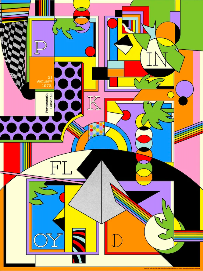 Tra le opere più visionarie, la psichedelica rivisitazione di Murugiah del capolavoro sonoro e concettuale dei Pink Floyd, The Dark Side of the Moon: un'esplosione di forme e simboli che traduce graficamente le tensioni e le visioni evocate dall’album.