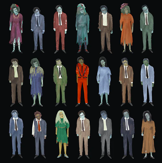 Non manca poi il tributo al leggendario Thriller di Michael Jackson, qui raccontato attraverso l’iconografia del celebre videoclip/mini-film diretto da John Landis, diventato una pietra miliare nella storia anche nel linguaggio visivo musicale e della cultura anni ’80.