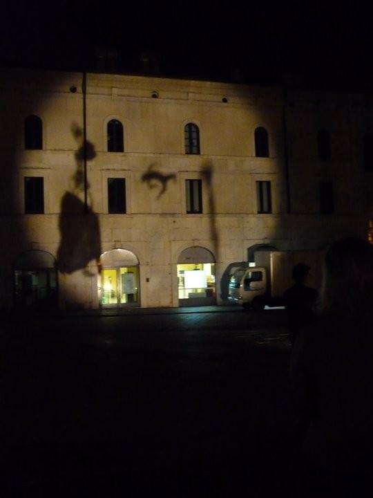 INTERVALLO vuole mettere in atto nello spazio di Piazza Loggia lo slittamento dal mondo terreno, regolato dal raziocinio del tempo, a quello parallelo, primitivo e misterioso dell’ombra. Un intervallo in cui i due mondi coesistono, come in un carnevale di figure, che illuminate si capovolgono, svelando nell’ombra il loro doppio, L’installazione è realizzata da Annamaria Gallo, Anna Merici, Sara Donati, e Natasa Korosec