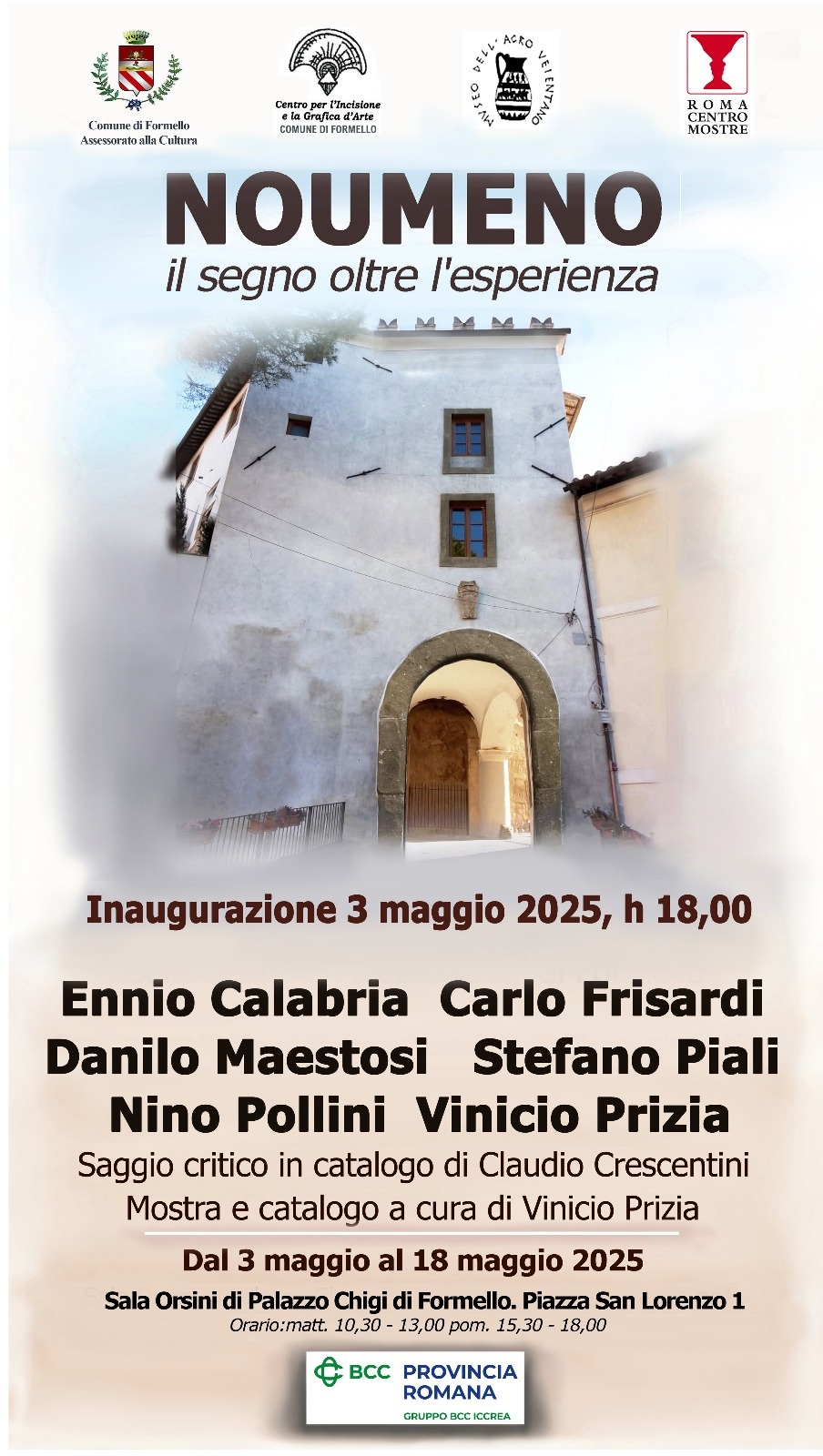 Inaugura a Formello, sabato 3 maggio 2025 alle ore 18:00 nella Sala Orsini di Palazzo Chigi (Piazza San Lorenzo,1), la mostra “NOUMENO. Il segno oltre l’esperienza”, visibile fino a domenica 18 maggio.