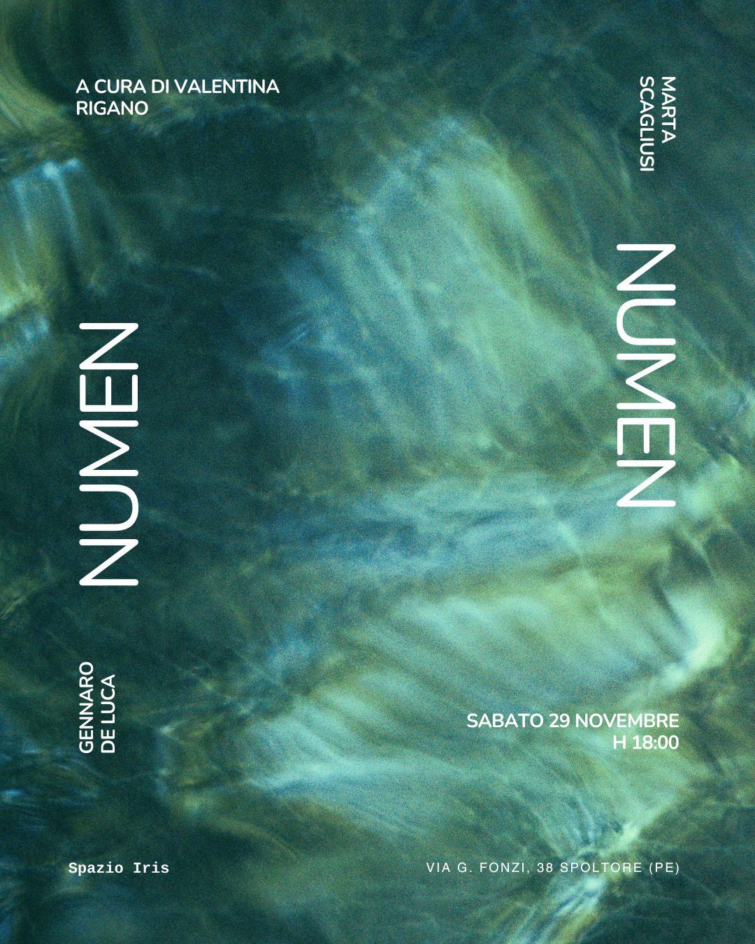 Il titolo della mostra, Numen, deriva dal latino, parola associata originariamente al concetto spirituale di “volontà divina della natura”, e del suo manifestarsi come segno, guida o rivelazione. Questo espediente diventa la chiave di lettura delle opere di De Luca e Scagliusi.