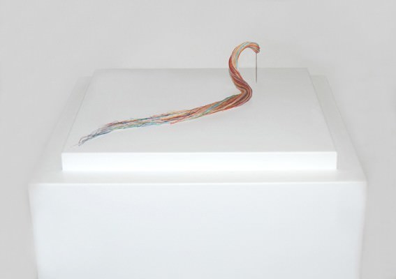 Note, unico lavoro in mostra, è un opera composta da un parallelepipedo in legno laccato, sul quale è fissato un ago, nella cui cruna, ci sono dei filamenti di cotone trasportati dallo stesso.