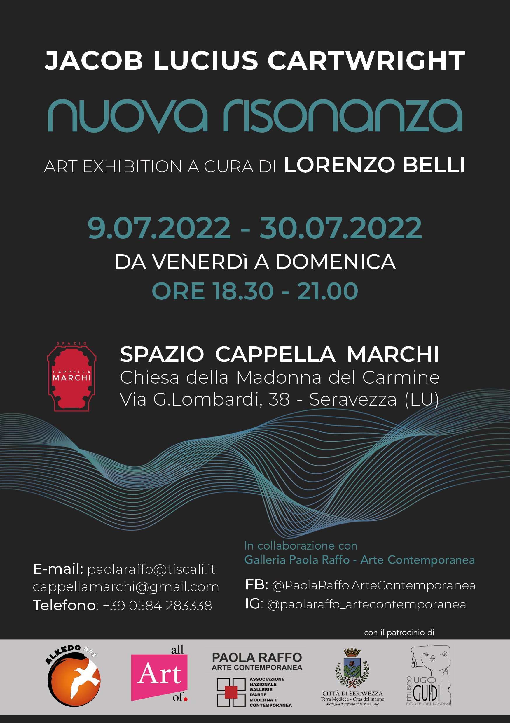 Dal 9 al 30 luglio 2022 allo Spazio Cappella Marchi, gestito da Alkedo aps, si terrà la mostra “Nuova Risonanza. Opere di Jacob Lucius Cartwright” a cura di Lorenzo Belli che presenterà opere recenti dell’artista concepite appositamente per lo spazio.
