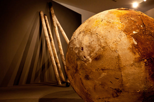 Nello specifico, sono presenti due lavori - una installazione e una scultura - dell'artista romano Marcello Mondazzi. La prima, costituita da una palla accompagnata da cinque pali, è realizzata in metacrilato combusto lavorato con oli e petroli e raffigura un mondo malato perché invaso dalla violenza e dalla sopraffazione, simboleggiati dai bastoni. Ma nonostante il grigiore e la scompostezza della superficie, attraversata da crateri e fratture, questo mondo conserva ancora la capacità di essere attraversato da un raggio di luce: infatti, come l'alabastro, se illuminato può accendersi di bagliori nascosti e mostrare a se stesso una possibilità di salvezza. Il cambiamento può ancora essere possibile e si determina nell'accoglienza della Luce. La seconda scultura di Mondazzi è un trilite: una porta realizzata con lo stesso metacrilato, materiale bisognoso di luce per risplendere. Si tratta di una soglia che divide lo spazio in due parti ponendo all'uomo la domanda e la riflessione sull'accoglienza di ciò che si pone “al di là”: dell'accoglienza tanto tra uomini che si pongono su territori diversi, quanto verso Dio, un Infinito misericordioso che ha già oltrepassato quella soglia per rivelarsi alla realtà dell'uomo tramite il Suo figlio, Gesù. All'uomo, la scelta e la responsabilità del passo da compiere.