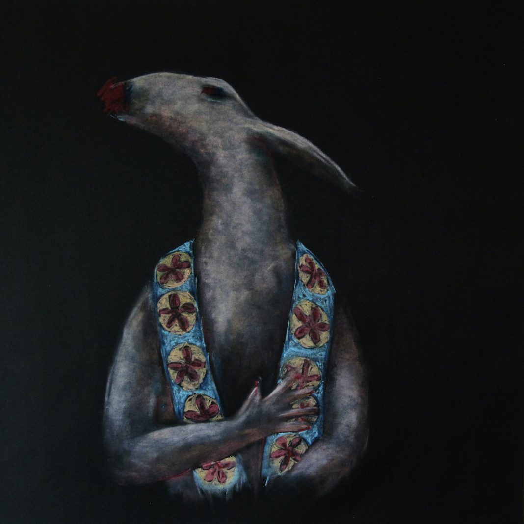 Non di meno il pigmento, come la sabbia, è una materia che per la sua stesura richiede un approccio fisico, un contatto diretto, tattile, con la composizione. Diversamente dai lavori con la sabbia, le figure antropomorfe protagoniste dei disegni, sono nude o quasi scarnificate, sospese nello smarrimento, in una ricerca di senso.