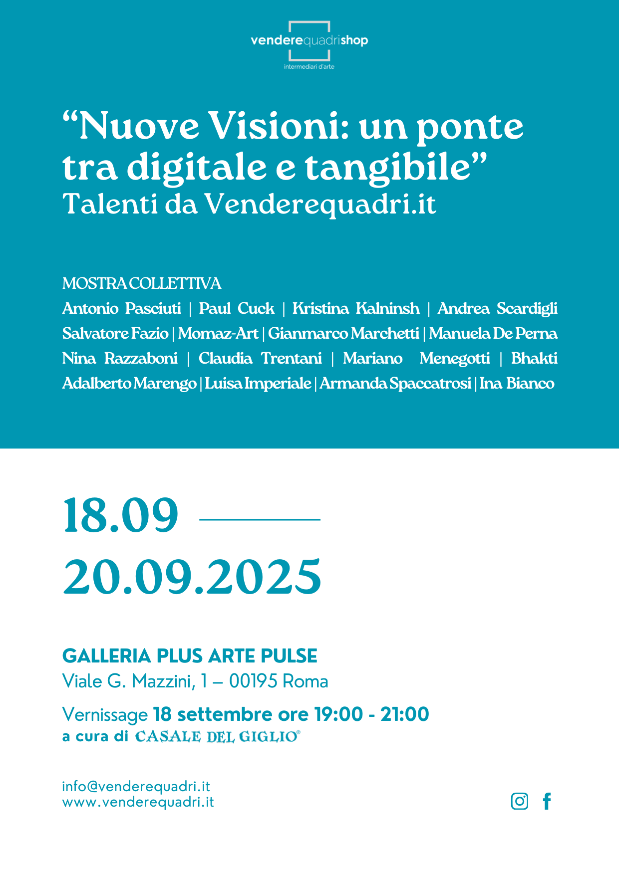 Venderequadri.it inaugura con “Nuove Visioni: un ponte tra digitale e tangibile” la prima di una serie di mostre dedicate a valorizzare gli artisti contemporanei e storicizzati selezionati attraverso la sua piattaforma. Un’iniziativa che intende dare continuità concreta al lavoro di promozione artistica già attivo online, offrendo uno spazio fisico dove arte, idee e pubblico possano incontrarsi e dialogare.