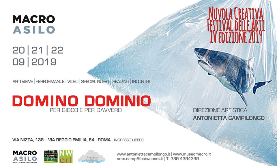 Torna, per il quarto anno consecutivo, il Festival delle Arti “Nuvola Creativa”, che quest'anno si svolgerà da venerdì 20 a domenica 22 settembre, presso il Macro Asilo di Roma, in via Nizza 138, stavolta con il titolo "Domino / Dominio - Per gioco e per davvero". Oltre settanta gli artisti coinvolti, provenienti da tutta Italia. Durante la kermesse si alterneranno mostre temporanee e proiezioni di video arte, performance teatrali e di danza, reading letterari e prose d'autore.
