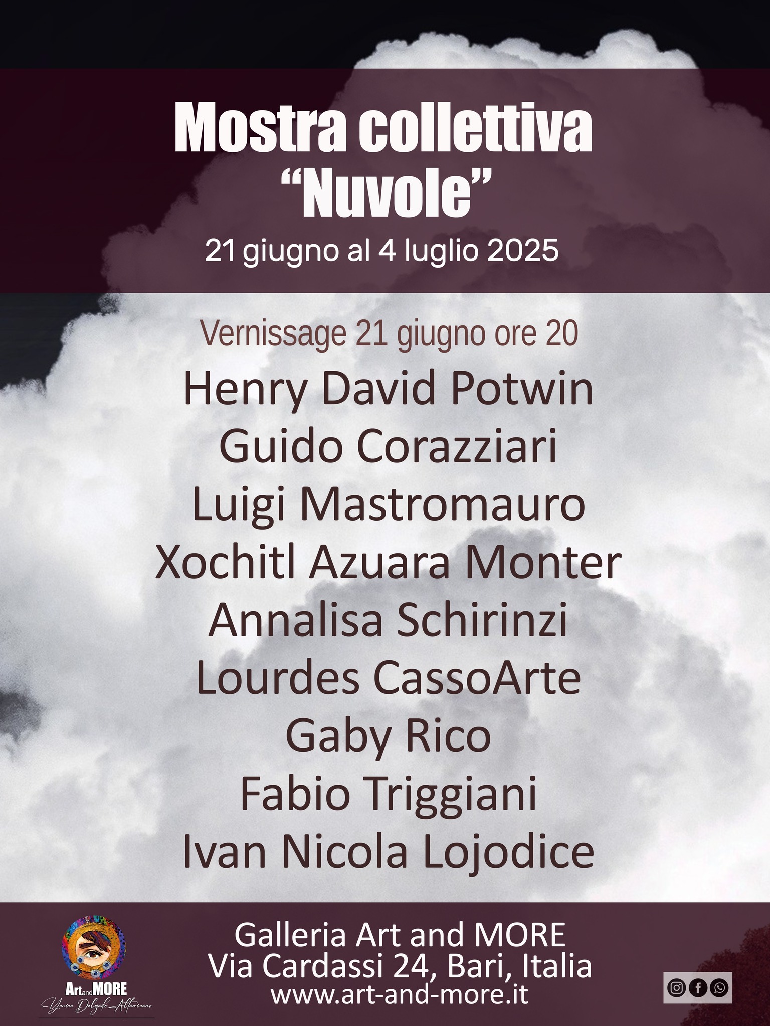 Mostra “NUVOLE” a Bari, 21 giugno-4 luglio, 9 artisti, ingresso libero, Galleria Art and MORE.