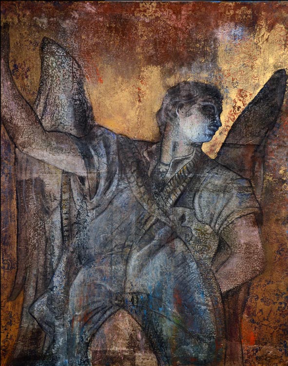 Armando Calvelli da sempre è stato affascinato dalla sua terra di origine, la Toscana. Attratto dalle chiese e dagli affreschi in esse contenuti, dalle sculture e scritture ha subito il fascino dell’antico e della storia trasferendo la sua passione nell’arte. Ammirando gli affreschi, specie quelli consumati dal tempo, attua pannelli in cui trasferisce la sua propensione per la figura umana sempre al centro della sua rappresentazione. Fuoriescono dalle soluzioni stratigrafiche uomini, sculture, angeli che quasi magicamente si palesano all’osservatore a seguito di una ricerca attenta, calibrata, studiata e grandemente resa tra sovrapposizioni diverse. Scortica, acidifica e appone per dare vita ad opere che sono piccoli capolavori dal senso estetico classico; un lavoro intenso e certosino si cela in ogni opera d’arte. Un’arte da studiare ed osservare a lungo per coglierne ricerca e studio, dettagli e sorprese. C’è un forte impatto emozionale a prima vista, ma tutto non termina nella figura rappresentata perché sul fondo si apre un mondo fatto di intenso lavoro e istinto. Una mano sapiente, si muove con maestria sul supporto, passando dall’aerografo alla macerazione della carta in olio e acqua finchè ogni strato non raggiunge la leggerezza sottile della pelle che si adagia allo strato precedente per creare una stratificazione complessa in cui si intravedono le trasparenze, esattamente come un affresco consumato dal tempo. Non c’è dubbio che si tratti di un’arte inconsueta realizzata con una tale maestria da non avere paragoni nel panorama artistico contemporaneo.