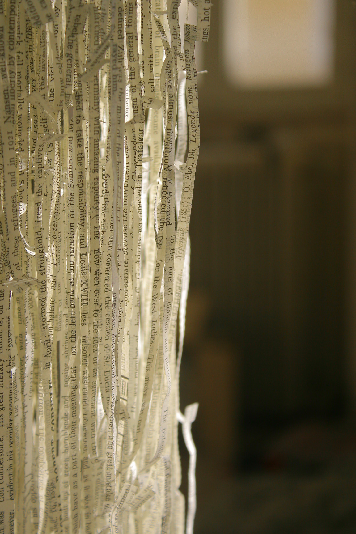 Tagliuzzando a mano con grande precisione e pazienza le pagine dei libri, Jukhee Kwon crea sculture sospese che si aprono e cadono come cascate. Jukhee e’ affascinata dalla trasformazione di oggetti ordinari in oggetti non-ordinari.