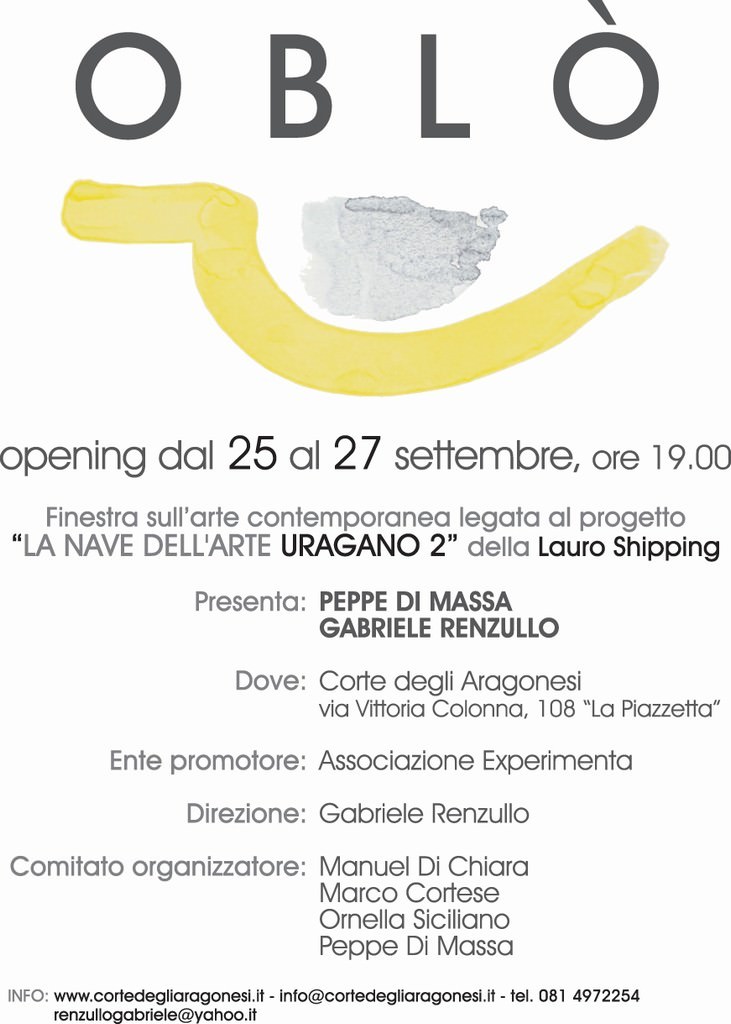 Lo staff di artisti si presenterà al pubblico il 4 Settembre 2009 con una mostra di Manuel Di Chiara e successivamente ogni fine settimana di Settembre dando vita ad “OBLÒ” , un progetto legato al “La Nave dell’arte Uragano 2”, una finestra sull’arte contemporanea dove il pubblico potrà conoscere gli artisti ed i successivi sviluppi dell’atelier sperimentale.