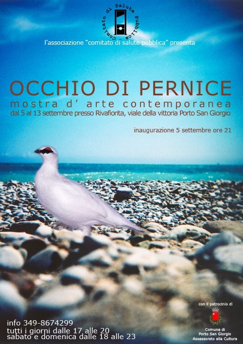 Occhio di pernice, si svolgerà dal 5 al 13 settembre presso i locali interni di Riva Fiorita a Porto San Giorgio, rimarrà aperta dal lunedì al venerdì dalle 17.00 alle 20.00, sabato e domenica dalle 18.00 alle 23.00, l’associazione presenta una serie di lavori inediti ed eterogenei: pittorici, scultorei, fotografici e multimediali.