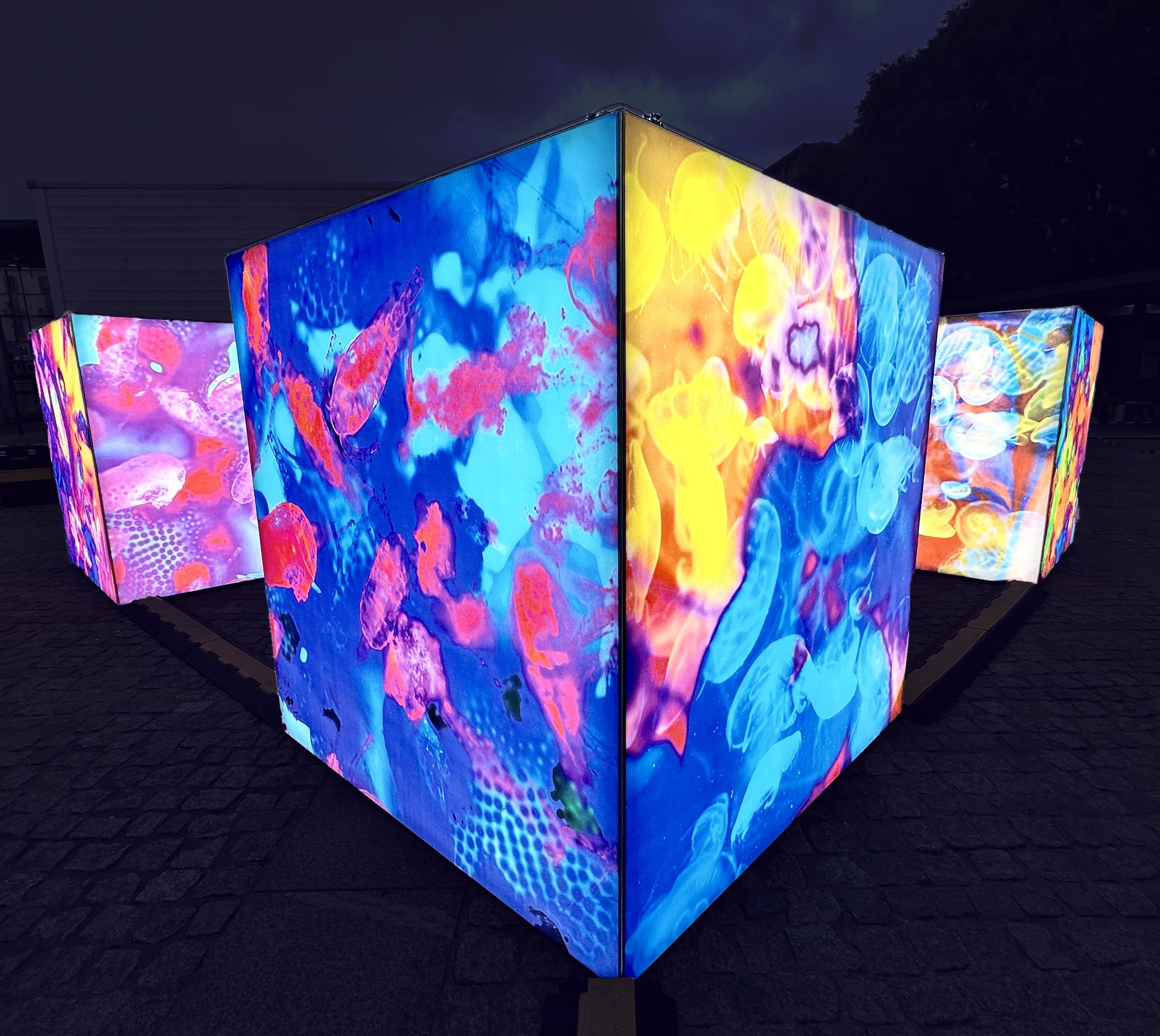 In Oceanic Humanity, Avvassena intreccia arte, scienza e poesia in una forte e unica nel suo genere installazione luminosa site-specific, realizzata con la tecnologia Quadruslight per One Ocean Foundation in occasione dell’Ocean Week. Tre cubi luminosi, si accendono di immagini policrome che nascono dalla fusione di radiografie umane e microfotografie di plancton: due universi apparentemente distanti, ma che l’artista riconnette in un’unica trama visiva e simbolica.