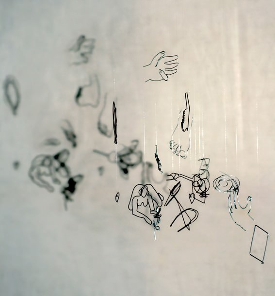Indagine è un lavoro che Floreal porta avanti dal 1993. Consiste nell’accumulare piccoli elementi (mani, ragazze, piedi, quadri, archi, fiori, cuori…) che danno vita ad un complesso ed affastellato sciame di segni che mano mano si aggiornano con l’incremento di esperienze personali. Negli spazi della DORA DIAMANTI interverrà con un’inedita installazione site specific nello spazio interrato della galleria partendo però dalla bidimensionalità dei lavori in argento e grafite su tavola e acquaforte nello spazio superiore. L’invasività dell’installazione sottostante è determinata dal convertire in fil di ferro ciò che Floreal abitualmente fa in disegno. Costruisce una massa grave al centro della stanza, anticipata da piccoli elementi sospesi in aria che coinvolgono la scala che unisce i due ambienti. La composizione in ferro verrà illuminata dalla luce direzionale che permetterà la “ribidimensionalizzazione” delle forme in ombra sul muro.