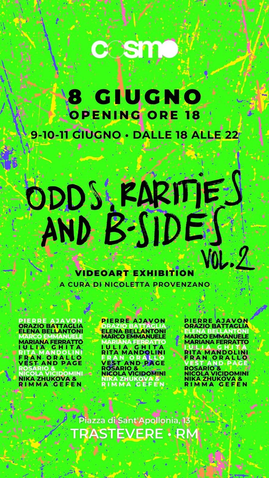 La rassegna Odds, rarities and B-sides è un viaggio ispirato alle compilation delle band anni ’80 e ’90. Presenta lavori meno noti o inediti che compongono un Volume di sperimentazioni e nuove visioni del linguaggio video all‘interno della ricerca artistica, inusuale per alcuni artisti partecipanti