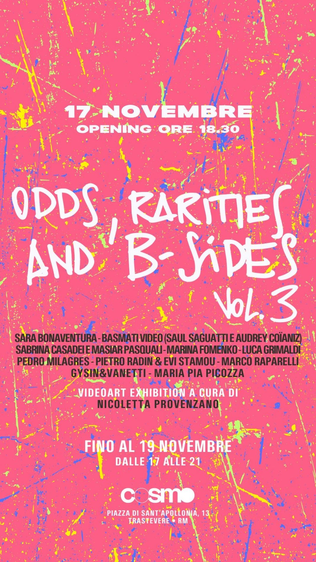 La rassegna Odds, rarities and B-sides Vol.3 nello scorrere degli accenti ritmici di ogni singolarità visiva si proietta in una peregrinazione che sonda territori e umanità, realtà e relazione, interiorità ed esteriorità, possibilità e pericoli, straordinarietà e assurdi, umorismi e rarità.
