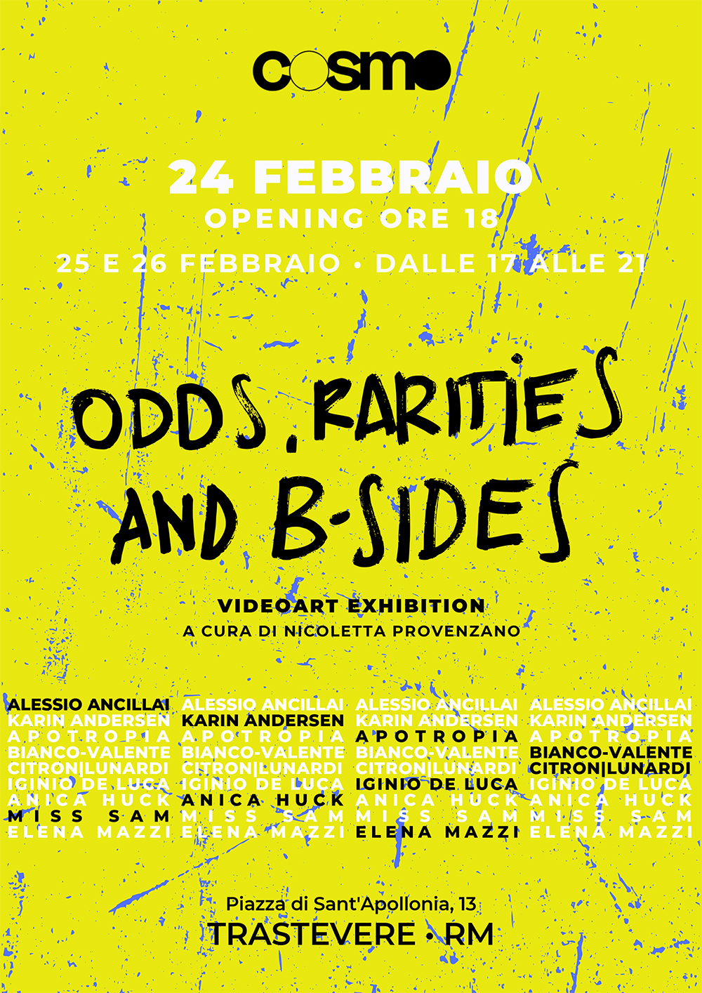 Il 24 febbraio 2023, Cosmo presenta la rassegna di videoarte Odds, rarities and B-sides, a cura di Nicoletta Provenzano e con la direzione artistica di Zaelia Bishop: una immersione nel bizzarro e nell’insolito, nelle rarità e singolarità, una miscellanea che si addentra nell’extra-ordinario della ricerca, in un ipotetico e figurato retro di un long playing, nelle sfaccettature liminali tracciate oltre il canonico.