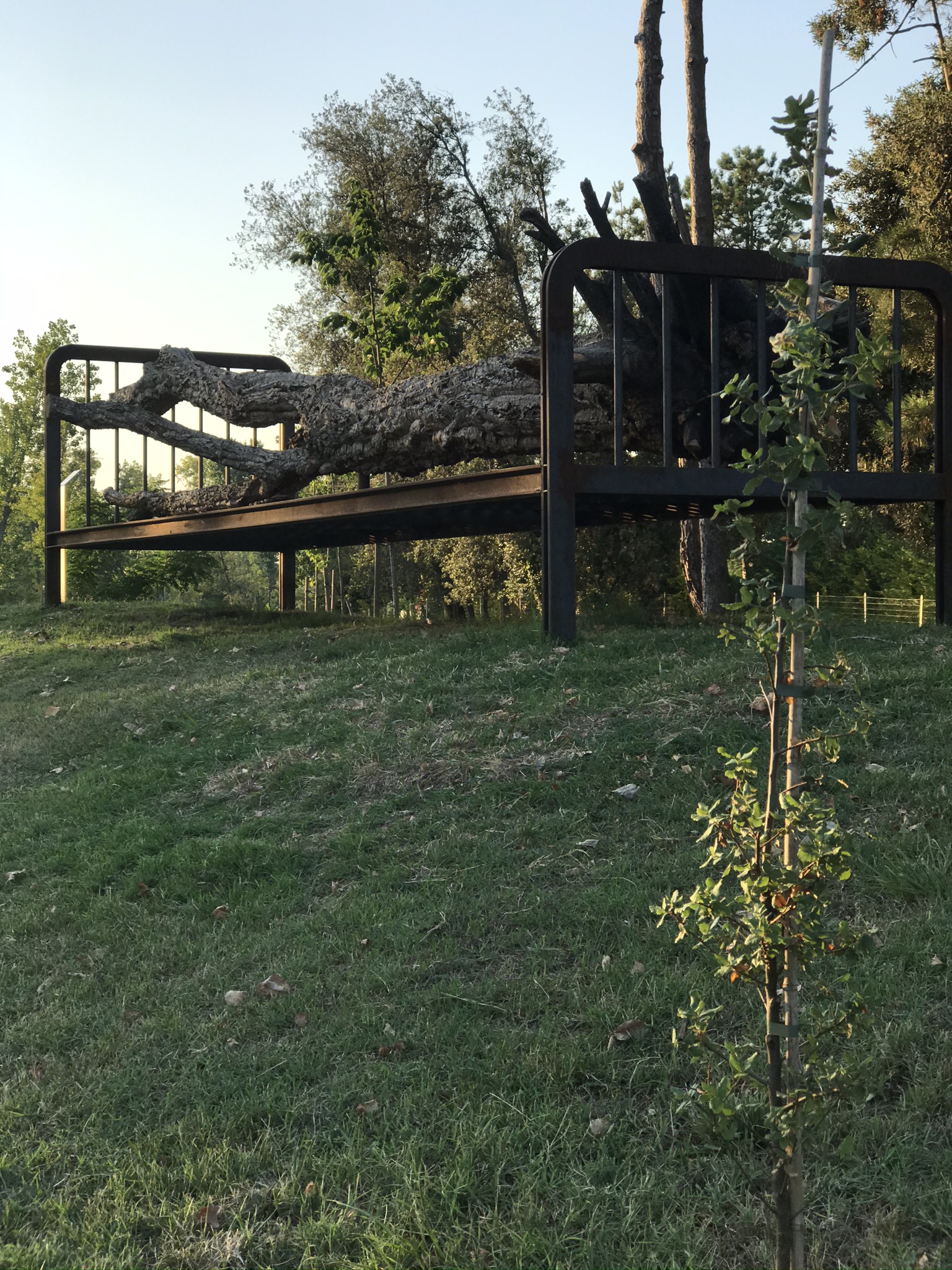 Altra opera apparentemente semplice ma che ribadisce il concetto di cura – rifacendosi all’Enciclica Papale sulla Cura della Casa Comune - è la scultura “La Foglia”, dove una foglia di ferro sorregge un albero piegato dal vento e destinato a cadere o essere tagliato.