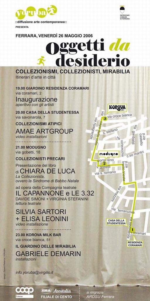 nel suo libro “La Collezionista, ovvero la Sindrome di Babbo Natale”, dove la protagonista arriva patologicamente a collezionare colloqui di lavoro, gli attori Davide Simoni e Virginia Stefanini, della Compagnia teatrale il Capannone e Le 3.32 di Bologna, proporranno una lettura teatrale. A seguire, presentazione della video installazione di Silvia Sartori e Elisa Leonini, giovani artiste ferraresi.