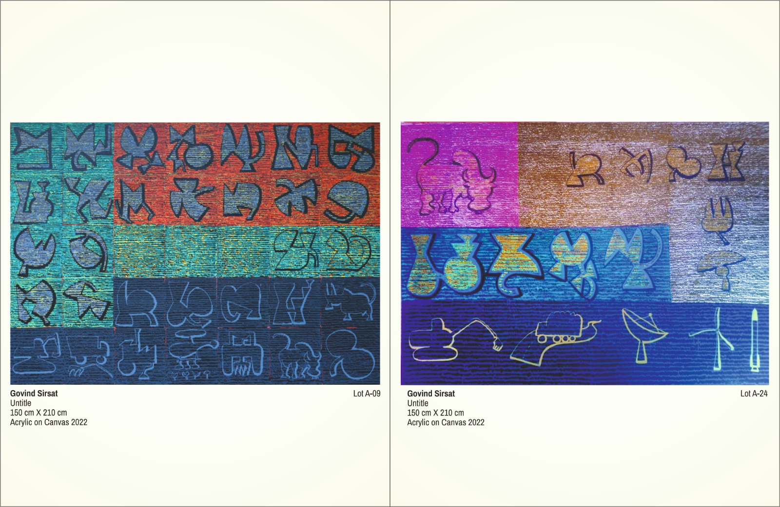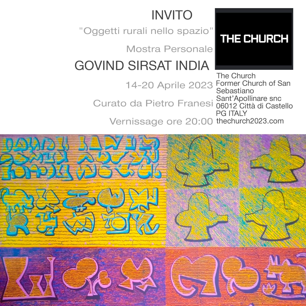 Govind Sirsat, artista indiano è la prima volta che espone in Italia. La sua ricerca è rivolta al superamento del concetto di tempo. Ha inventato un alfabeto con gli oggetti rurali del suo villaggio, per usare il futuro come chiave dell’oggi. Quattro opere di grandi dimensioni.