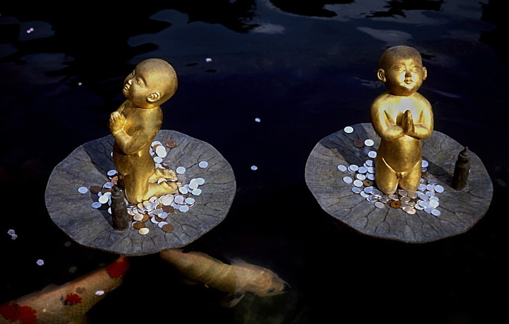 Paola Ghirotti da anni lavora sulla cultura giapponese, per i « profani » così lontana ed il più delle volte indecifrabile. Cosa rappresenteranno due statuine votive che galleggiano su fragili foglie di loto nel tempio dedicato a Kobo Daishi ?