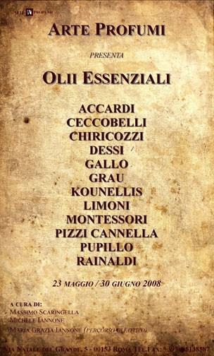 Questa mostra, tutta di opere su carta, composta da 12 artisti con 12 modi diversi di utilizzare l’olio, nelle sue varie componenti e combinazioni, vedra associato un percorso olfattivo a cura di Maria Grazia Iannone che abbinerà 12 essenze appositamente fatte per l’occasione alle 12 opere. Sottolineando un duplice omaggio a questo elemento così presente nel nostro quotidiano.