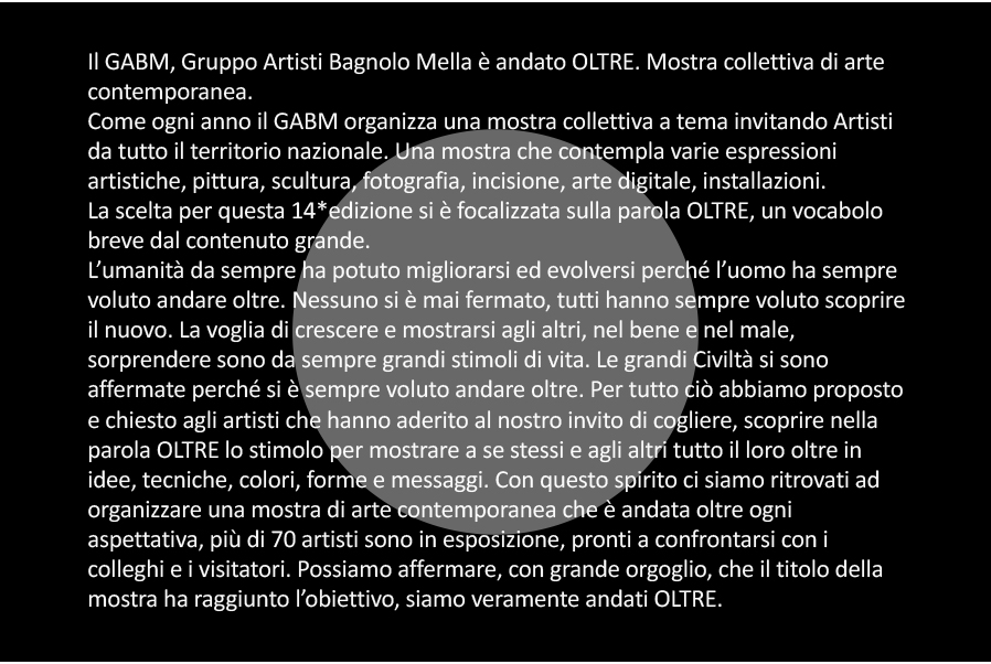 Come ogni anno il GABM organizza una mostra collettiva a tema invitando Artisti da tutto il territorio nazionale. Una mostra che contempla varie espressioni artistiche, pittura, scultura, fotografia, incisione, arte digitale, installazioni. La scelta per questa 14*edizione si è focalizzata sulla parola “oltre”, un vocabolo breve dal contenuto grande.