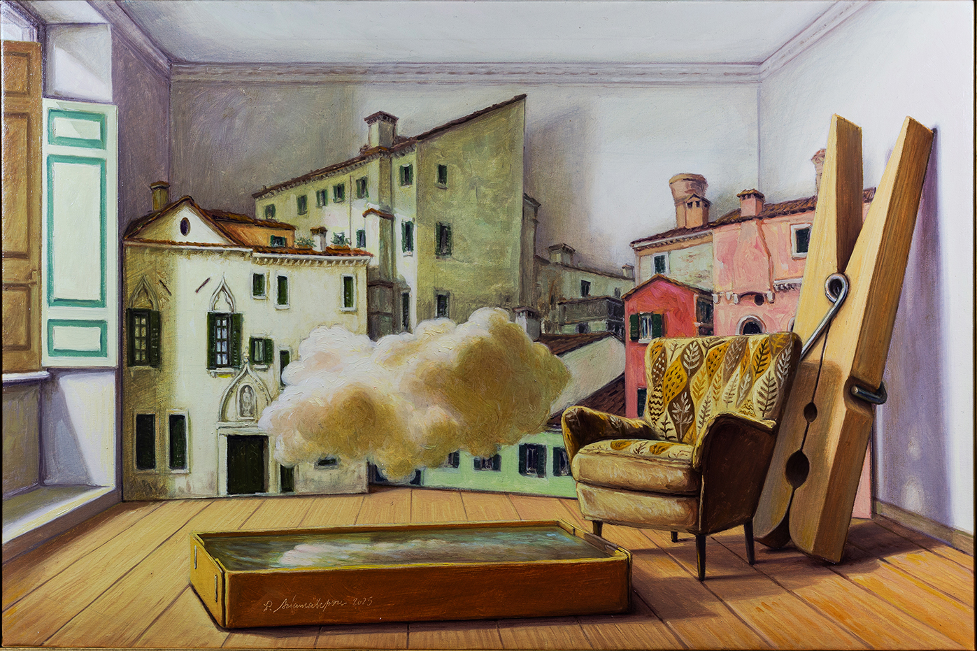 L'opera di Sciancalepore trasporta l'osservatore in un mondo dove lo studio dell'artista non ha più pareti: la natura, con i suoi corsi d'acqua, rocce e nuvole sospese, invade lo spazio creativo in un