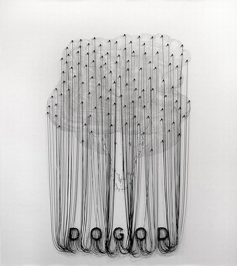 Thomas Feuerstein lavora con i mezzi artistici più disparati, assegnando un ruolo importante al disegno. Elementi essenziali per i suoi lavori sono la combinazione di arte e scienza nonché la dialettica tra fatti reali e fatti costruiti che nella sua opera vengono uniti in una narrazione concettuale. I due lavori creati per la mostra, GODOG e DOGOD, sono due anagrammi ossia palindromi basati sulle parole God (Dio) e Dog (cane). I termini vengono trascritti per mezzo di cavi e spine. I cavi fungono da prolungamento spaziale del tratto grafico e si sovrappongono in un secondo livello al disegno a mano. I termini polari marcano in miti e filosofia la posizione dell’uomo tra gli animali e gli Dei. Per quanto riguarda l’iconografia, alla base del quadro GODOG sta una testa con cervello e nervi e alla base del quadro DOGOD un intestino e un cranio di cane. Organi umani si trovano anche spesso nell’opera di Michaela Math che lavora quasi esclusivamente con i mezzi classici del disegno: matita o china su carta. Il suo interesse è rivolto soprattutto alla complessità della nostra percezione della realtà. I disegni anatomici apparentemente precisi rivelano una vita interiore fittizia, tessuti si drappeggiano a formare esseri ibridi, strutture astratte si dispongono in una sterpaglia vegetativa. Per la mostra Math ha creato un intreccio di linee costituito da più di ottanta pezzi singoli che dal pavimento si innalza rigogliosamente come una pianta rampicante. La visualità oberata della realtà di vita attuale è invece programmatica per i lavori – veri e propri fiumi di immagini – della coppia di artisti Micha Payer & Martin Gabriel. I loro disegni a matita colorata formano ciascuno un universo a parte in cui svariati temi vengono analizzati e messi in discussione in modo logico-razionale e poetico-associativo. In questo modo in nulla dies sine linea, partendo da una mappa delle stelle del cartografo olandese Henricus Hondius del 1661, nasce il tentativo di rappresentare cartograficamente una terra incognita individuale che viene caricata di miti e feticci propri. Oppure nel lavoro toile d’enfance, attenendosi formalmente alla tradizione della Toile de Jouy (stoffe stampate in modo pregevole che riproducono in serie scene bucoliche o motivi ornamentali), vengono riflesse le formazioni dell’identità nell’infanzia e vengono tra l’altro tematizzati i metodi pedagogici crudeli e repressivi del rappresentante principale della pedagogia nera, Moritz Schreber. In contrasto con l’abbondanza ottica dei lavori di Payer & Gabriel stanno i disegni ridotti, dall’effetto quasi meditativo, di Heidrun Sandbichler. Per Sandbichler, che nel suo lavoro si avvale di diversi mezzi espressivi, il disegno assume un ruolo centrale. Il chiaro rigore logico della riduzione lascia la superficie del foglio da disegno per immergersi nelle profondità di processi concezionali e per scandagliare nuovi spazi mentali. I disegni presentati nella mostra provengono in gran parte dal ciclo Locus Solus e si occupano dell’omonimo romanzo dello scrittore francese Raymond Roussel del 1914.
