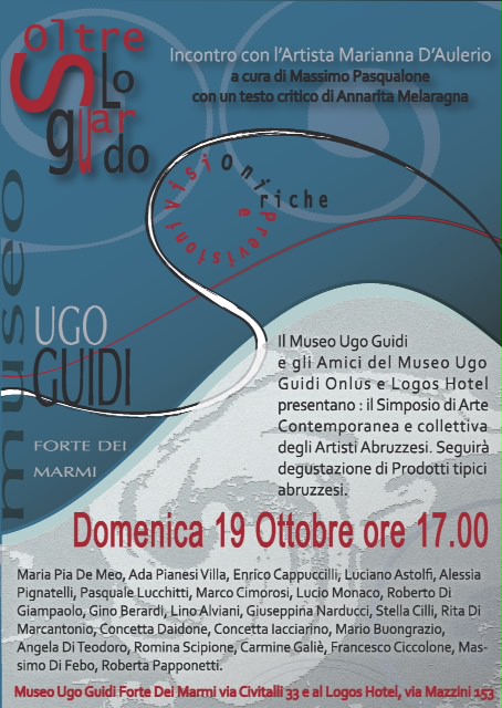 Il Museo Ugo Guidi e gli Amici del Museo Ugo Guidi Onlus presentano il simposio d’arte contemporanea “Oltre Lo Sguardo – Visioni e previsioni oniriche”, incontro con l’artista Marianna D’Aulerio a cura di Massimo Pasqualone con testo critico di Annarita Melaragna e collettiva degli artisti abruzzesi: Maria Pia De Meo, Ada Pianesi Villa, Enrico Cappuccilli, Luciano Astolfi, Alessia Pignatelli, Pasquale Lucchitti, Marco Cimorosi, Lucio Monaco, Roberto Di Giampaolo, Gino Berardi, Lino Alviani, Giuseppina Narducci, Stella Cilli, Rita Di Marcantonio, Concetta Daidone, Angela Di Teodoro, Romina Scipione, Carmine Galiè, Francesco Ciccolone, Massimo Di Febo, Roberta Papponetti, Concetta Iaccarino e Mario Buongrazio.