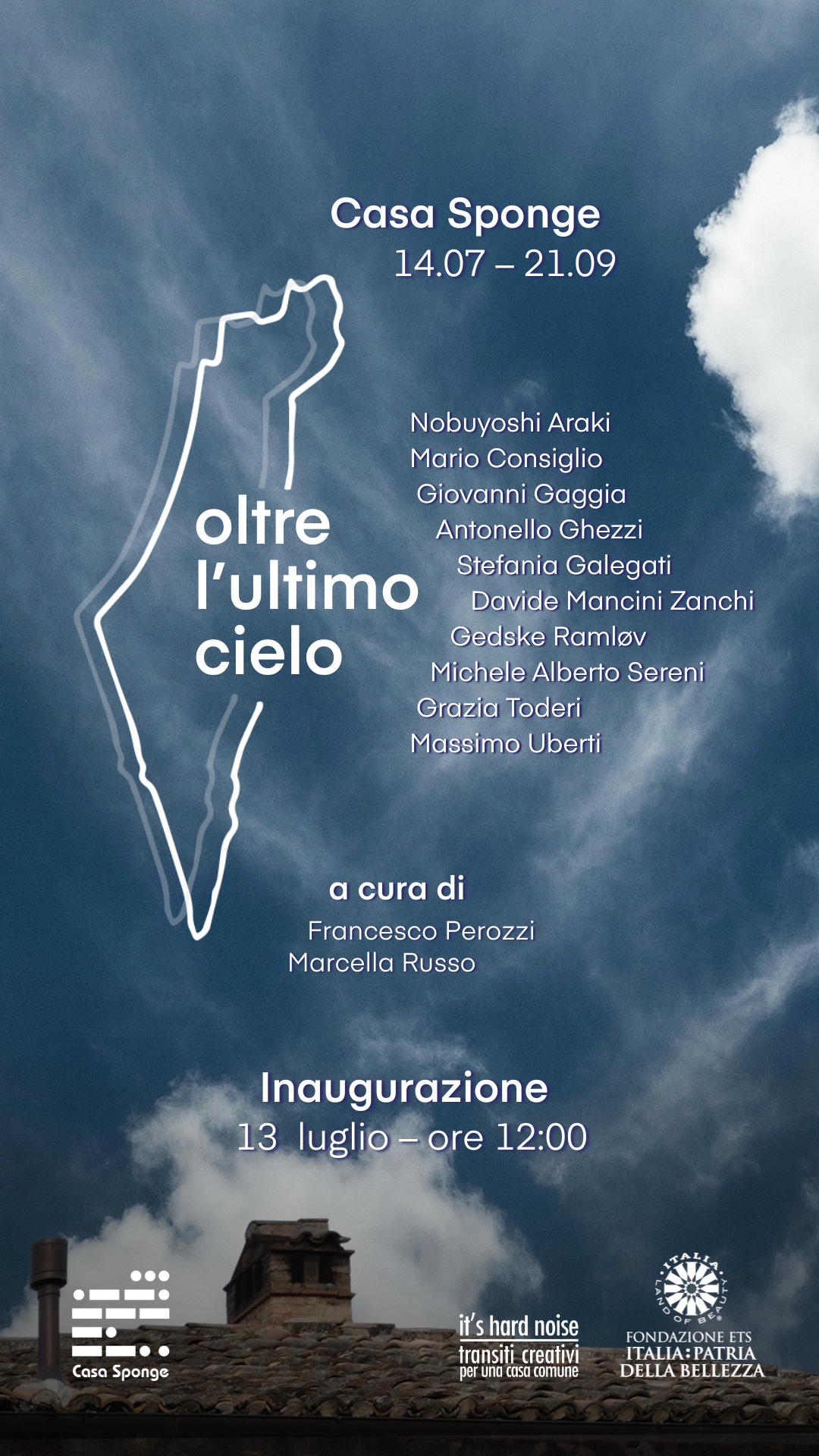 Dal 13 luglio al 21 settembre 2025 Casa Sponge ospita Oltre l’ultimo cielo, la prima tappa di un progetto articolato che si svilupperà nel tempo. Si comincia con una mostra collettiva che coinvolge 9 artisti + 1 – Nobuyoshi Araki, Mario Consiglio, Antonello Ghezzi, Stefania Galegati, Giovanni Gaggia, Davide Mancini Zanchi, Gedske Ramløv, Michele Alberto Sereni, Grazia Toderi e Massimo Uberti – chiamati a confrontarsi con il concetto di confine, oggi sempre più segnato da separazioni fisiche, culturali e simboliche.