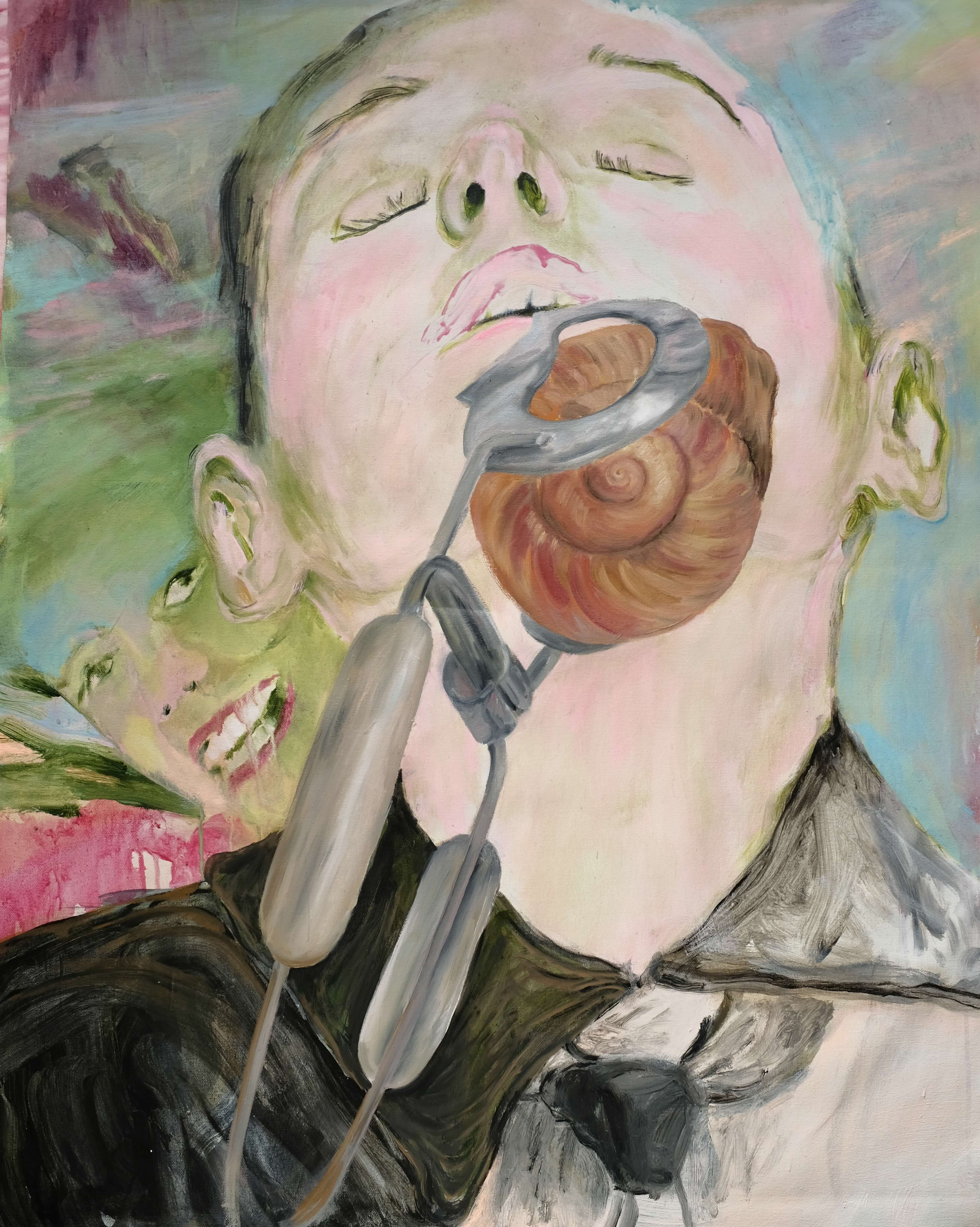 Through recurring images of ferocious female or genderless figures, either bent or turned away from the viewer, and grotesque faces thrown into a deep nostalgia mood, she examines the complexity and awkwardness of human behaviour and the sense of alienation that she believes defines her generation.