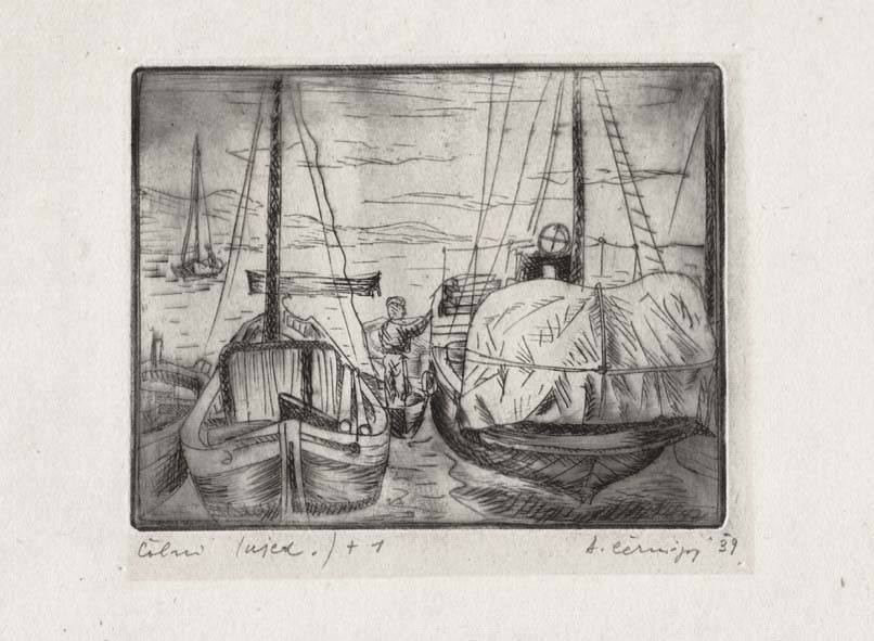 In mostra sono esposte anche delle brevi sequenze di nudi femminili disegnati a inchiostro durante un ricovero ospedaliero in età matura, due incisioni a tema erotico del periodo ’56-’57 e un’interessante xilografia che coglie quasi a volo d’uccello il panorama dei tetti di Trieste raccolti intorno alla sinagoga. Non manca il tema delle barche e dei pescatori, raffigurato secondo un sobrio gusto novecentista, sicchè la rassegna racchiude nel suo complesso una puntuale e raffinata testimonianza della sperimentazione nell’ambito del linguaggio figurativo, svolta da Cernigoj prima del coinvolgente approccio alla tendenza astratta e materica.