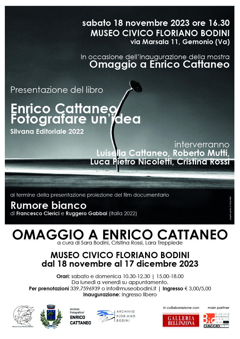 Sabato 18 novembre 2023 alle 16.30 sarà presentato il volume monografico di Giorgio Zanchetti e Luca Pietro Nicoletti Enrico Cattaneo. Fotografare un’idea (Silvana Editoriale 2023) presso il Museo Civico Floriano Bodini di Gemonio. Intervengono Luisella Cattaneo, Roberto Mutti, Luca Pietro Nicoletti, Cristina Rossi. Al termine dell’incontro verrà proiettato il film documentario dedicato al fotografo, Rumore bianco di Francesco Clerici e Ruggero Gabbai (Italia, 2022).