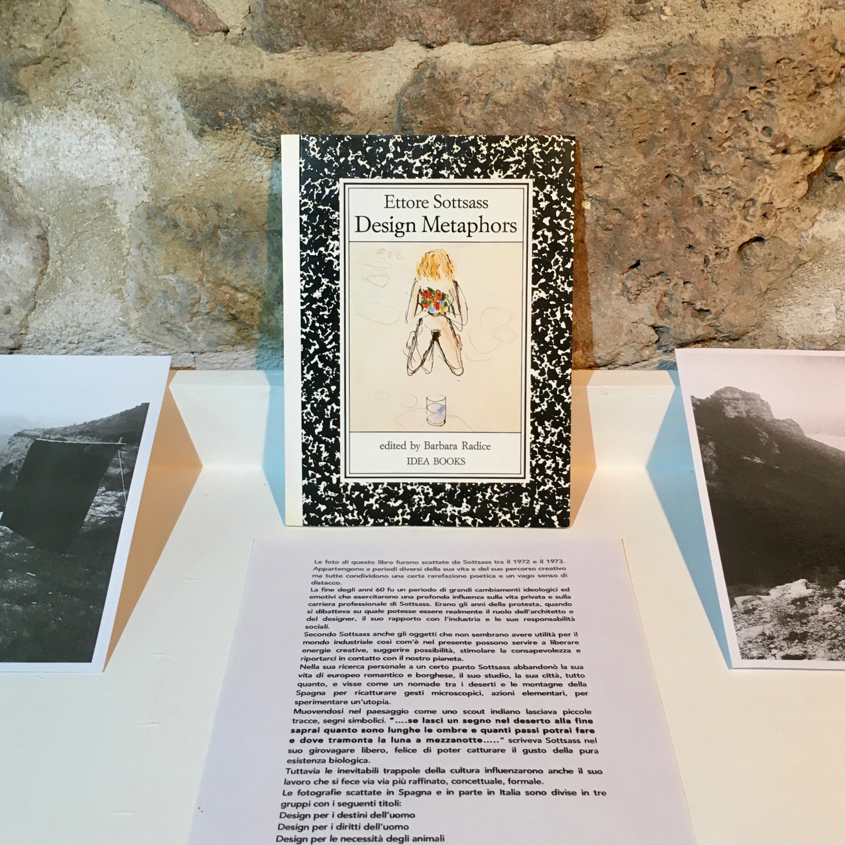In questa rassegna presento alcuni testi e una documentazione riguardanti il periodo che va dal 1980 al 1987: sono gli anni della vita errante nel deserto, in luoghi solitari e silenziosi, dove è soprattutto la natura selvaggia a parlargli; ma anche gli anni in cui progetta “mobili decorativi di stile moderno”… il che la dice lunga sull’innovazione della grafica e del design nell’oggetto d’arredo! In questo periodo, infatti, dà vita a Memphis, un collettivo di design e architettura che si distingue per progetti audaci, caratterizzati da colori vivaci e forme geometriche.