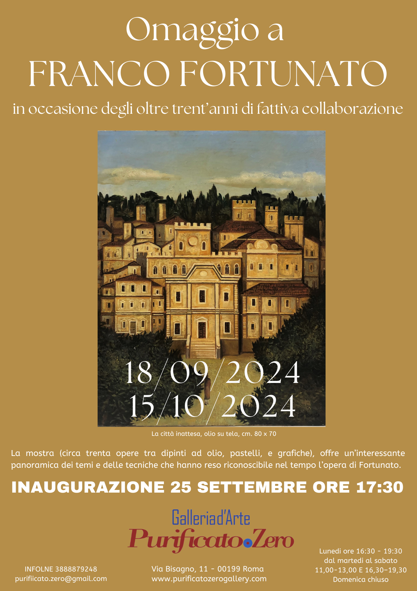 La mostra si propone di rappresentare la maggior parte delle tappe più rappresentative del percorso pittorico di un artista giunto al significativo traguardo dei ”quarant’anni di attività”. La figura di Franco Fortunato è cresciuta nel tempo ed ha assunto negli anni un rilievo che supera i confini cittadini e regionali da cui ovviamente è partita. Ciò è potuto avvenire principalmente attraverso l’iniziativa e il lavoro promozionale delle strutture facenti riferimento alla figura di Pino Purificato (ITALARTE, ITALARTE FINE PRINT, NOVECENTO ARTE CONTEMPORANEA, DOMUS ARTE, PURIFICATO.ZERO) e alle Gallerie da lui gestite a Roma (Italarte, Italarte Fine Print, Domus Arte, L’Indicatore, XX Art Space, Silber Gallery, Purificato.Zero), Milano (Galleria Senato), Verona (Galleria Italarte Verona), Napoli (Domus Arte Napoli), Parigi (Domus Arte Parigi), ma anche attraverso le innumerevoli mostre organizzate dall’ ITALARTE in gallerie private, spazi pubblici e fiere dell’arte tra le più prestigiose, in Italia e all’estero, A tale contributo si aggiungono i relativi cataloghi realizzati nel tempo e i fondamentali libri monografici che rappresentano le vere pietre miliari dell’attività di un artista giunta alla svolta dei quarant’anni. Un traguardo sicuramente ragguardevole ma anche un delicato punto di svolta per la responsabilità di dover consolidare adeguatamente i risultati finora conseguiti.
