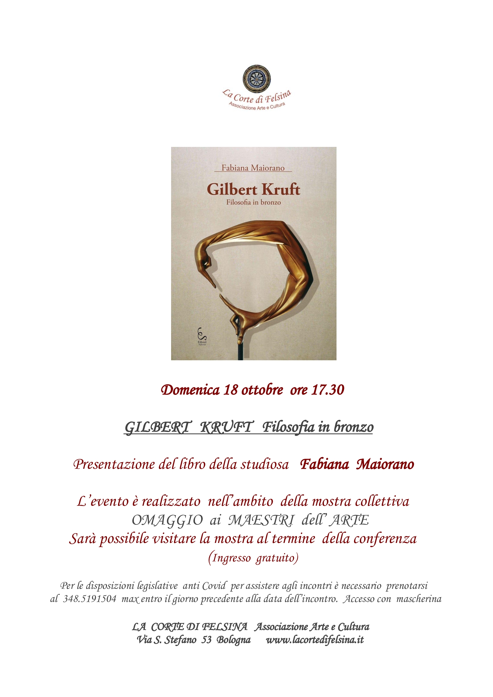 - Domenica 18 ottobre ore 17.30 Presentazione della monografia “ Gilbert Kruft filosofia in bronzo”. Edizioni Edisud Salerno. Relatrice : Fabiana Maiorano, storica dell’arte