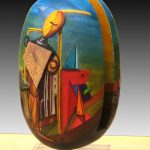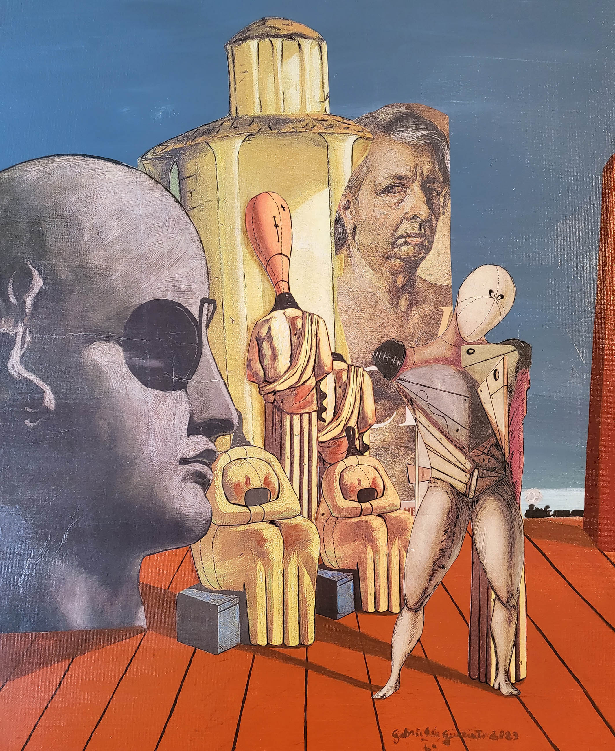 Nel quadro OMAGGIO ALLA METAFISICA, un concentrato di elementi eseguiti con tecnica a collages e colori acrilici, l’artista inserisce soggetti “presi in prestito”: da Le Muse, il volto di Guillaume Apollinaire tratto da La nostalgia del poeta, il manichino tratto da Il Trovatore, la visione del treno lontano….tutti elementi riconoscibili del linguaggio tipico delle avanguardie artistiche del 900.