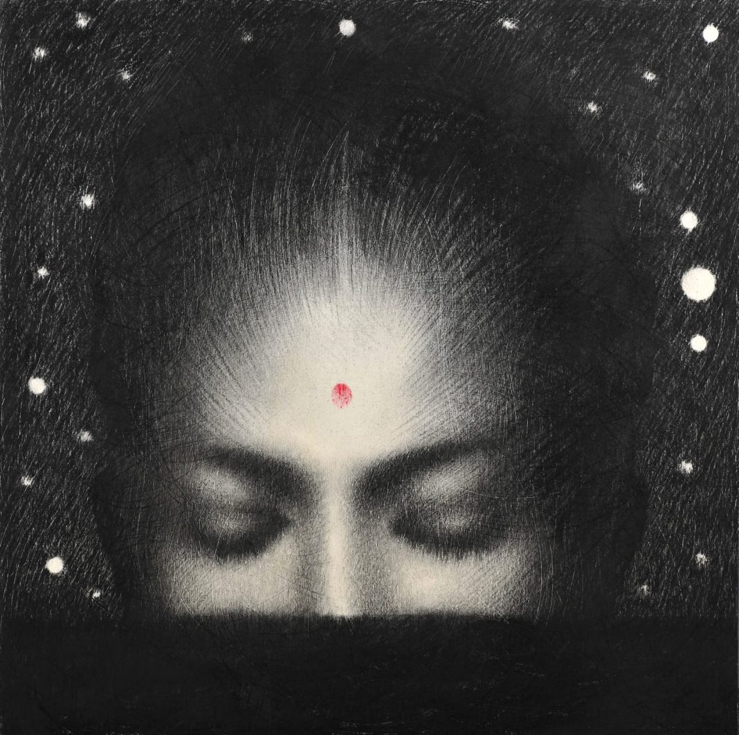 Una piccola e splendida tavola, Mantra del 2023, brillante nel nero cangiante della grafite, suggella l'esposizione tra Occidente e Oriente e viceversa: summa di tutta la vetrina, diventa il cuore della mostra, nel cuore vivo e palpitante della città.