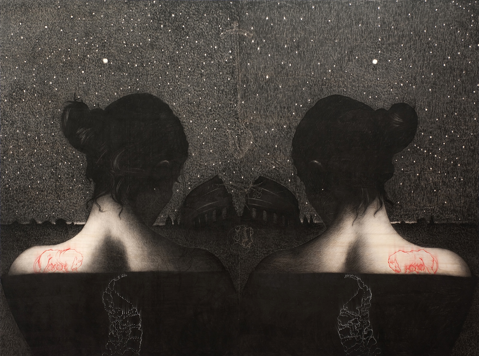 Il disegno ha un suo tempo di esecuzione che per l’artista si traduce in giorni e giorni, ore e ore di fatica. La pressione sanguigna modifica il segno, si imprime sul foglio di carta o sulla tavola di pioppo. Il lavoro è la prima religione di Omar Galliani; il disegno è il suo mantra, la sua pietra filosofale per l’immortalità.
