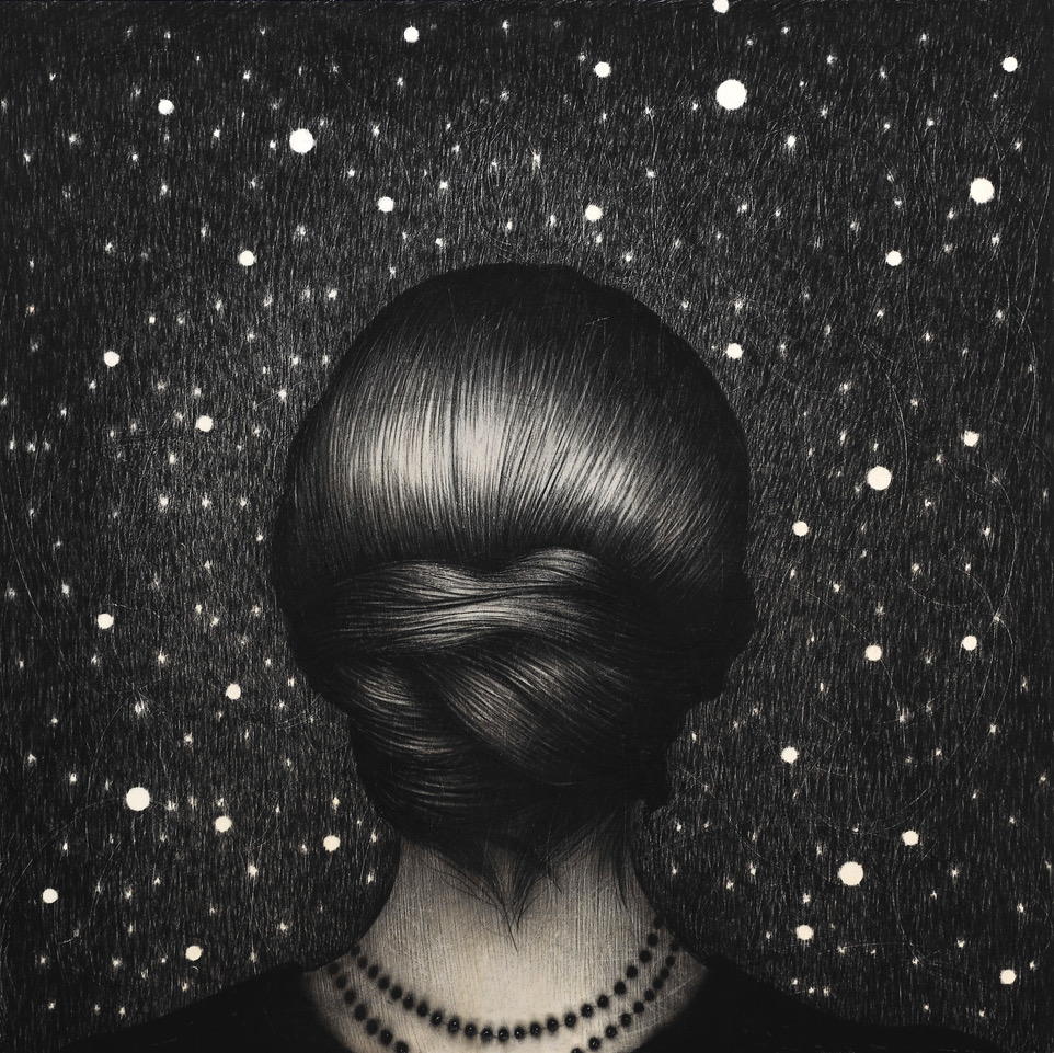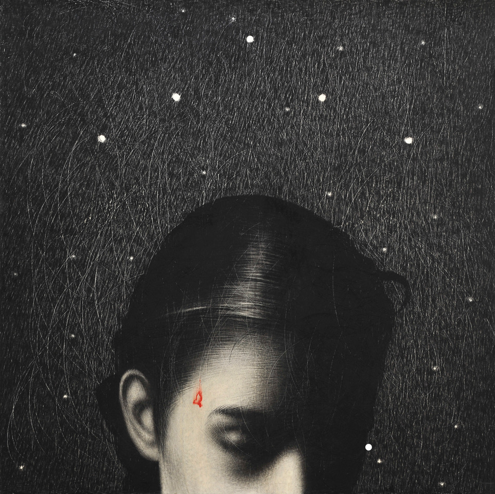 Questo legame con il territorio è ancora una volta testimoniato dall’inedita sezione realizzata appositamente da Galliani per questa esposizione ascolana – e che da essa prende il titolo – ispirata al mito della Sibilla Picena, anche nota come Sibilla Appenninica, immagine identitaria del territorio: tra le vette dei Monti Sibillini dimorava una donna di straordinaria bellezza, interlocutrice tra il cielo e la terra, tra il divino e l’umano. Sulle tavole in mostra riecheggia la poetica celeste dell’artista, legata a cieli infiniti e a universi di stelle lontane. Le sibille di Galliani sono donne di grafite con occhi serrati, colte nel profondo momento di meditazione. Sul volto di queste enigmatiche figure compare, incisa come un tatuaggio di pigmento rosso, la lettera : l’inizio della profezia, l’origine del tutto.