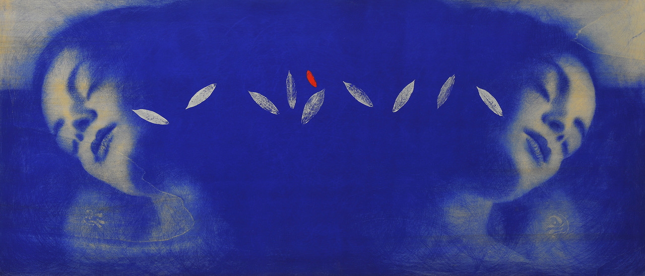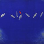 Si aggiunge in mostra la sezione Paesaggi interiori, che racchiude opere ispirate a paesaggi reali, percezioni del mondo esterno ora trasformato in simbolica rappresentazione di mondi interiori, e la sezione De rerum natura ispirata dall’opera filosofica di Lucrezio, che esplora la connessione tra l’uomo e la natura attraverso la rappresentazione di due momenti fondamentali, la morte e la rinascita. E ancora, la parte dedicata a Blu oltremare, che prende vita dall’essenza del colore blu, ad evocare il mare e il cielo, l’illusione di una prospettiva aerea e marina che si dissolve in infinite sfumature. Poi Baci rubati / Covid 19, realizzata durante il periodo di Pandemia, è invece una filmografia disegnata, che oltre a stimolare una riflessione emotiva sul periodo di isolamento fisico, intende evidenziare il rapporto persistente e intenso dell’artista con il mondo del cinema.
