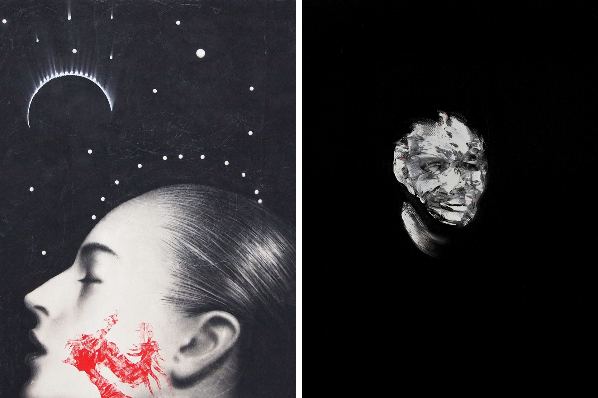 Il contrasto tra luce e ombra ci pone di fronte ad un’altra coppia di antinomie, poste dai due artisti in reciproco rapporto dinamico: l’uso della matita su fondo chiaro in Galliani porta a un disvelamento dei corpi che costituiscono aggregazione di materia scura; mentre la pennellata con colore chiaro su fondo nero in Puglisi rivela la luce che, prima celata nel nero, rende visibile frammenti di realtà.