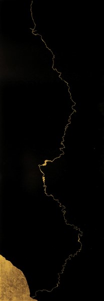 Una delle opere di Massimiliano Galliani presente in mostra – “Tevere” (2017) – si lega in particolare alla storia di Città di Castello, tracciando il percorso del grande fiume dell’Italia centrale in foglia d’oro. L’acqua, infatti, è metafora della vita, oggi probabilmente più preziosa dell’oro.