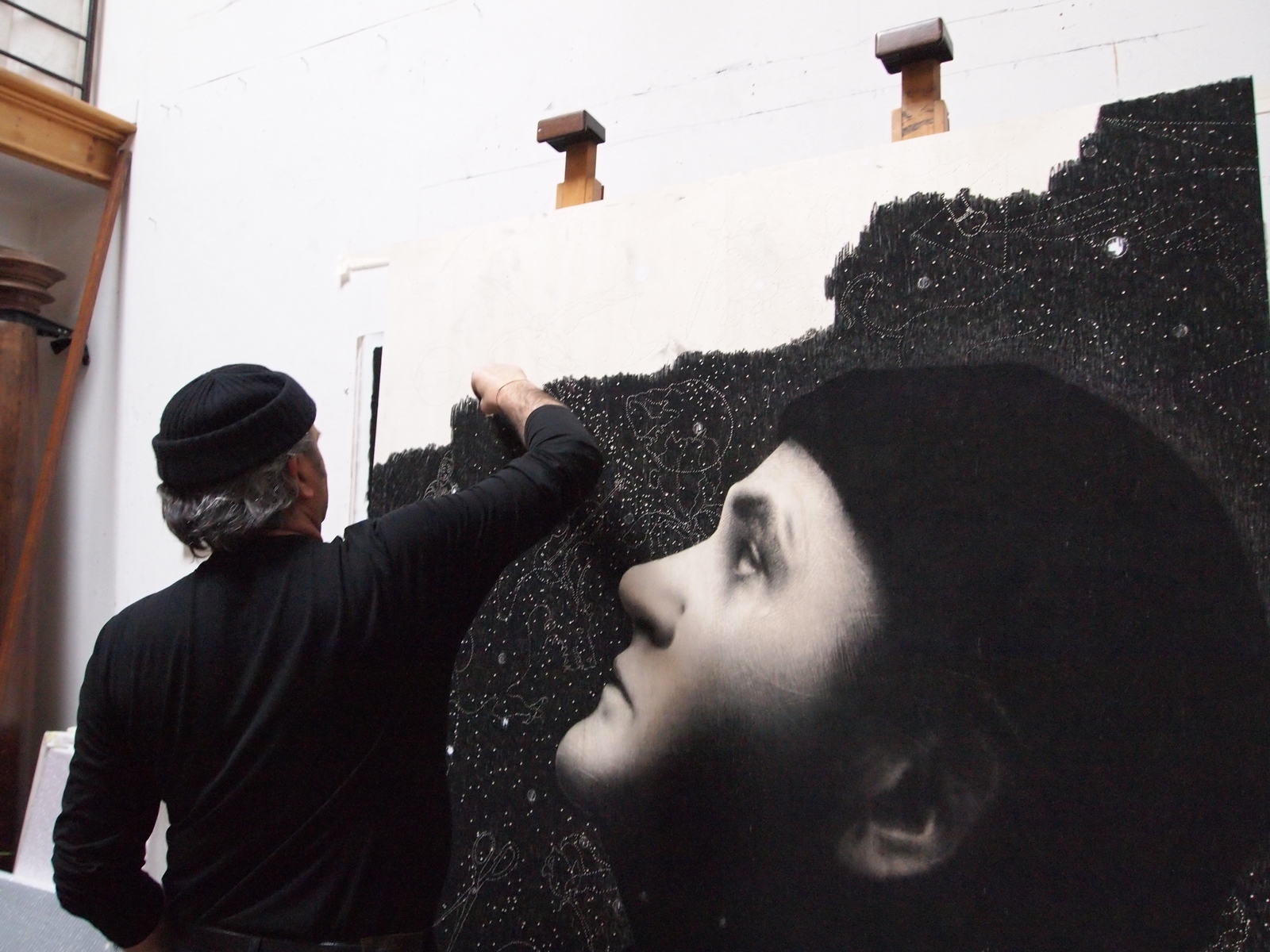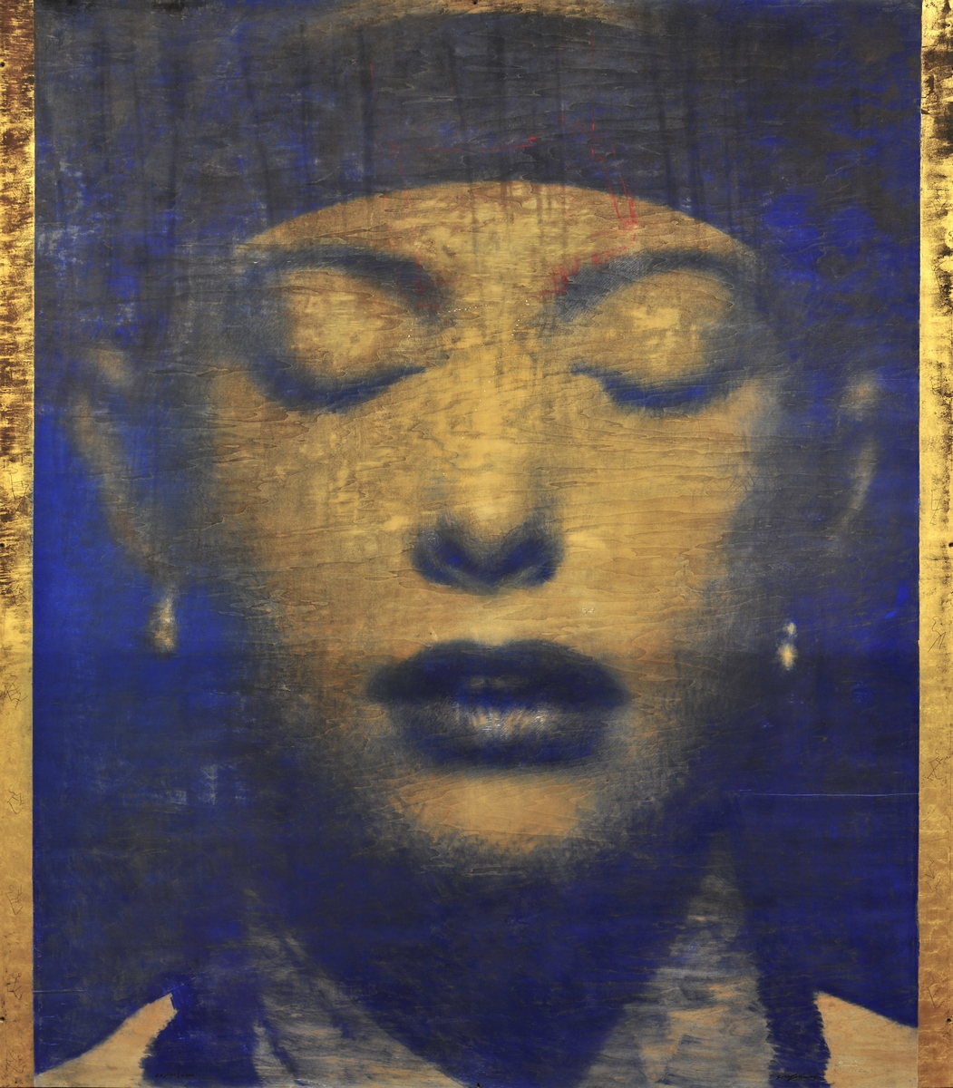 La Sala Musica della Fondazione Franco Zeffirelli Onlus, nata come Oratorio per gli Oratoriani di San Filippo Neri, ospita una grande tavola di Omar Galliani, immersa nella penombra. Un fascio di luce illumina un volto blu oltremare, realizzato con pastelli policromi e oro in foglia. Espressione di fragilità e fortezza, il viso di donna si rispecchia nel suo doppio, in un volo di fiori e farfalle. Ad una tavola disegnata, disposta in alto sulla balconata, fa eco un lungo tappeto stampato, proiettato verso il catino absidale.