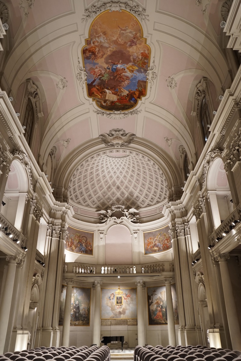 La Sala Musica della Fondazione Zeffirelli, o Oratorio del Complesso di San Firenze, ultimato sotto la direzione di Zanobi del Rosso nel 1775, presenta all’interno un apparato decorativo e pittorico, incorniciato da eleganti lesene, il quale ricorda la vita di San Filippo Neri in opere pittoriche di Gesualdo Francesco Ferri e di Filippo Burci, ma anche la funzione della sala dedicata al canto delle laudi e all’esecuzione di musica sacra. Eleganti colonne sostengono una grande cantoria che raccorda i palchi delle pareti longitudinali, mentre la volta centrale ospita l’affresco di Giuliano Traballesi dedicato all’Assunzione della Vergine. Questa elegante cornice, che da tempo è tornata ad accogliere l’esecuzione musicale a cui si sono aggiunte attività performative, ospiterà l’installazione di Galliani in un gioco di riflessi e prospettive coinvolgenti.