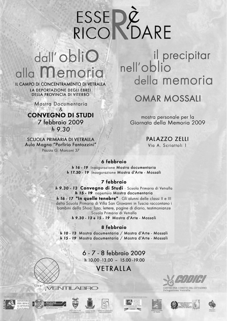 Da una parte un Convegno di studi e un Mostra Documentaria (sul Campo di Concentramento di Vetralla e la deportazione degli ebrei della provincia di Viterbo), dall’altra una Mostra Artistica (delle opere di Omar Mossali sullo scorrere del tempo, l’oblio, il ricordo e il mutamento). Il Convegno di Studi si terrà sabato 7 febbraio a partire dalle ore 9.30 presso la Scuola Primaria (Aula Magna “Porfirio Fantozzini”, Piazza Marconi 37). Interverranno Francesco Biancucci (Vice Sindaco di Vetralla), Alessandro Giacchetti (prefetto di Viterbo), Alessandro Mazzoli (Presidente della Provincia di Viterbo), Orfeo Potenza (Assessore alla cultura della Comunità Montana dei Cimini), Roberto Santoni (Dirigente Scolastico Direzione Didattica Statale di Vetralla), Enrico Pasquinelli (Presidente Pro Loco Vetralla), Ivano Giacomelli (Segretario Nazionale CODICI), Paolo Antinucci (Cooperativa Il Ventilabro), Carlo Spartaco Capogreco (Università della Calabria), Augusto Goletti (Direttore Archivio di Stato di Viterbo), Daniele Camilli (CODICI Vetralla), Gianluca Di Prospero (Ricercatore) e Mary Jane Cryan (Giornalista). Durante il Convegno verrà infine proiettato un documentario di testimonianze orali realizzato da Emanuele Zarlenga (Coop. Il Ventilabro, Cinematografia) e Sara Leoni (CODICI Vetralla, Montaggio). A moderare il tutto, Roberta de Vito (Coop. Il Ventilabro). Il Convegno di studi ha l’obiettivo di rendere pubblici i risultati della ricerca condotta dalla Ventilabro e da CODICI sul Campo di concentramento di Vetralla, così come sulla deportazione degli ebrei della provincia di Viterbo. Un’occasione per riflettere anche sulle strutture e le dinamiche dell’universo concentrazionario e le sue possibili conseguenze.