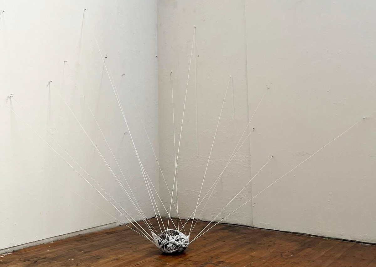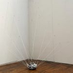 L’elemento della pietra, nel suo essere profondamente terrestre, ancora e costringe a sentire la realtà nella sua gravità. È una presenza stabile che viene sospesa, segretamente, da fili bianchi che la distanziano quanto basta per differenziarla dal suolo. La maglia sottile collega il cielo con la pietra, avvolgendo la Terra e i suoi gravi.