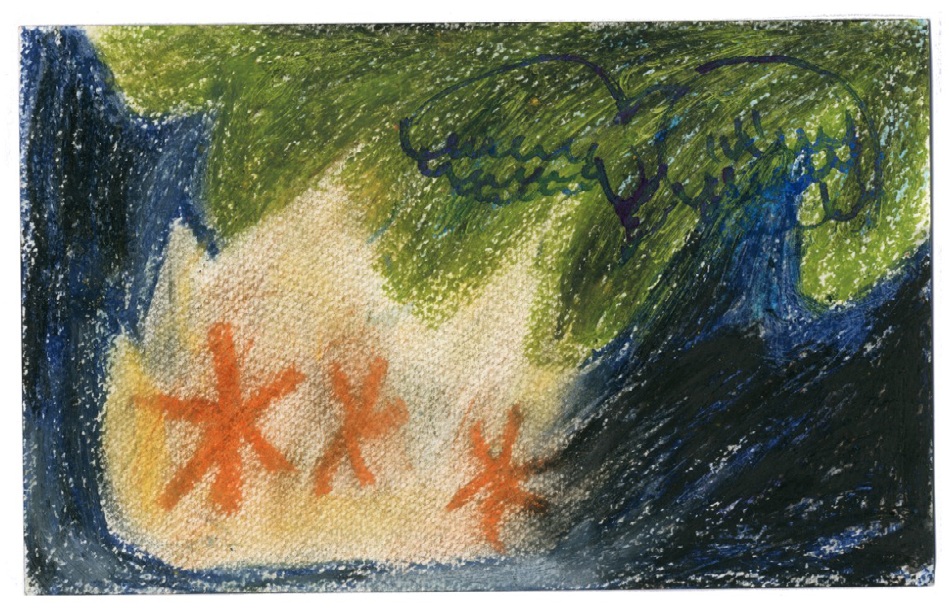 “Gli angeli prendono in affitto la casa affianco alla nostra”, da Bestiario invisibile, tecnica mista su carta, 14x21 cm, 2023